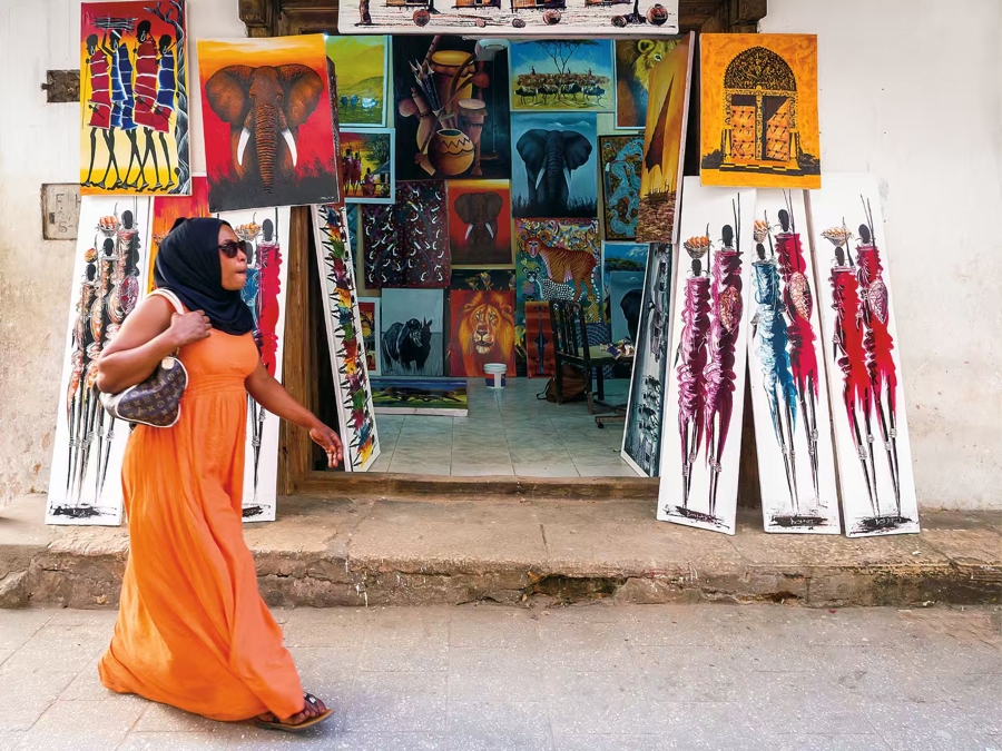 坦桑尼亚桑给巴尔石头城路边的Tingatinga画作。 (视觉中国 供图)