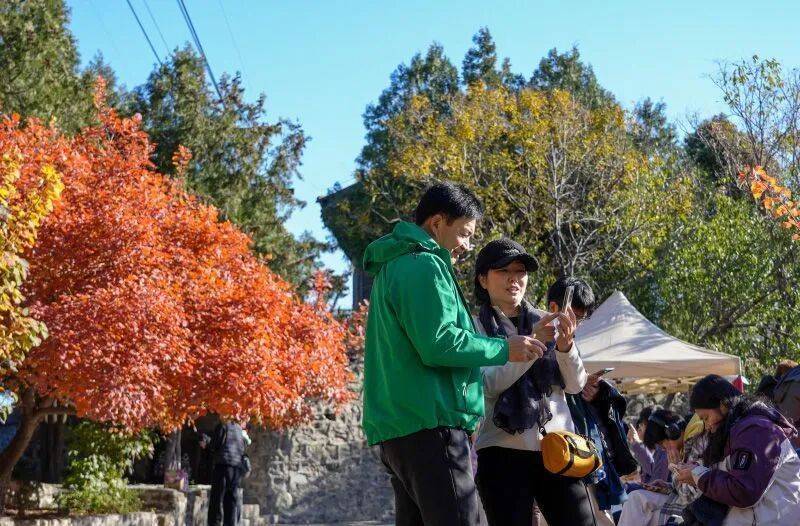 11月2日,香山公园,红叶成了最美背景板,不少游客驻足树下拍照留念。目前,香山公园彩叶整体变色率已达约60%,主要红叶树种黄栌落叶率仅10%-15%,景观正值壮美。预计最佳观赏期将持续至下周末。